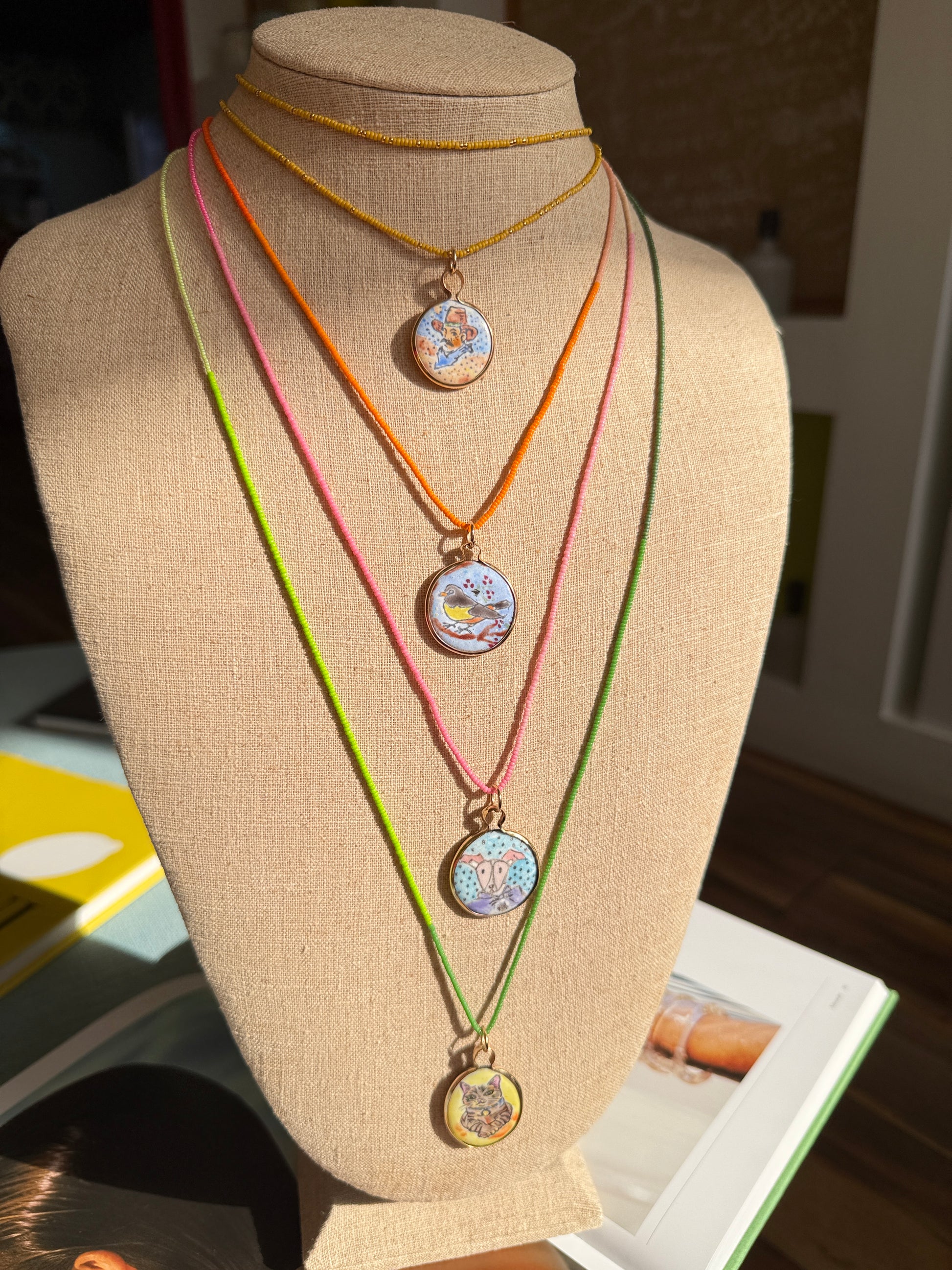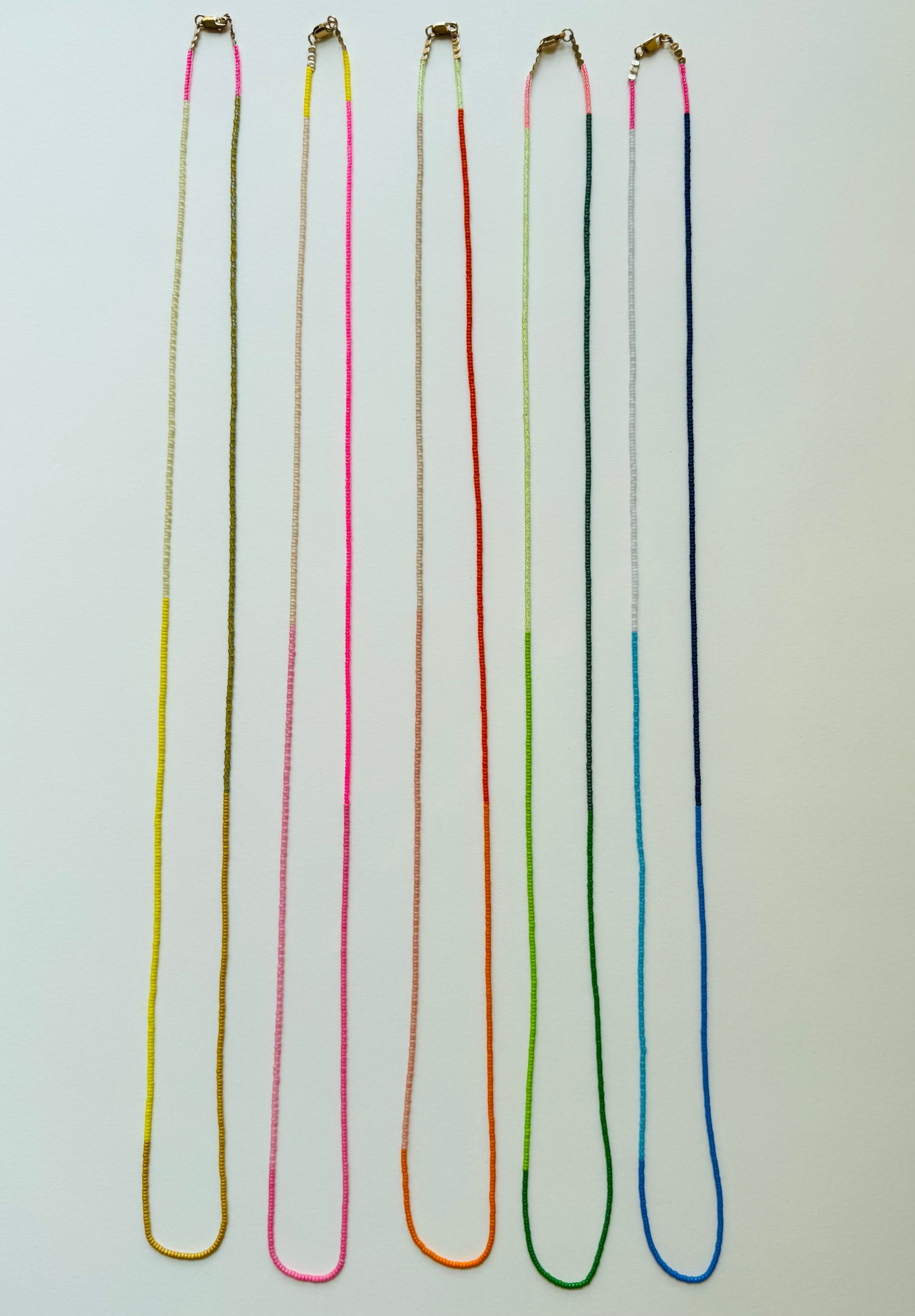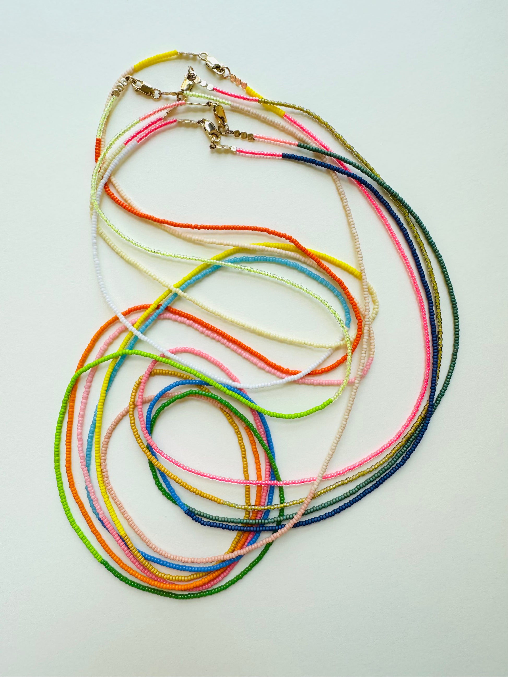 Seed beads, strung on silk thread, finished with Gold-filled lobster clasp, measures approx. 30"