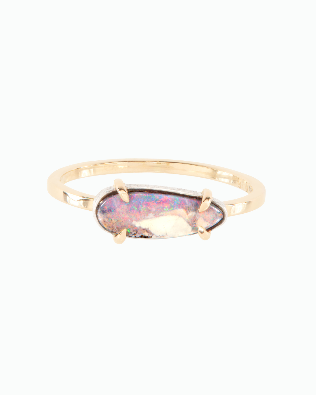 Let me take you by the hand and lead you through the streets of London, past Georgian buildings and the alleyways of quaint Hampstead Village. Like the singular opal selected for this ring, each visit will never be the same. Every opal set in this gold and silver solitaire ring is one-of-a-kind, varying in cut and shape for your handmade creation.