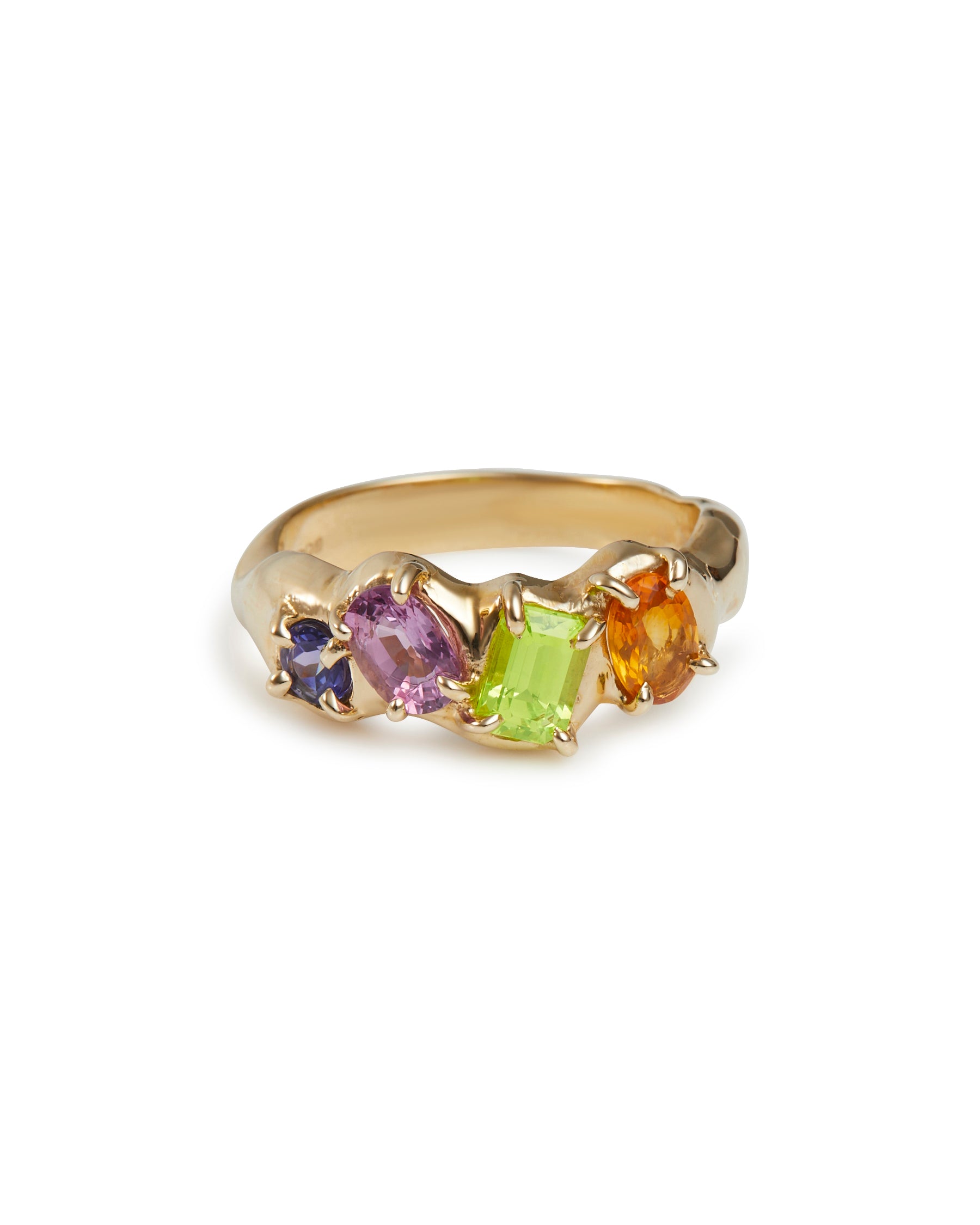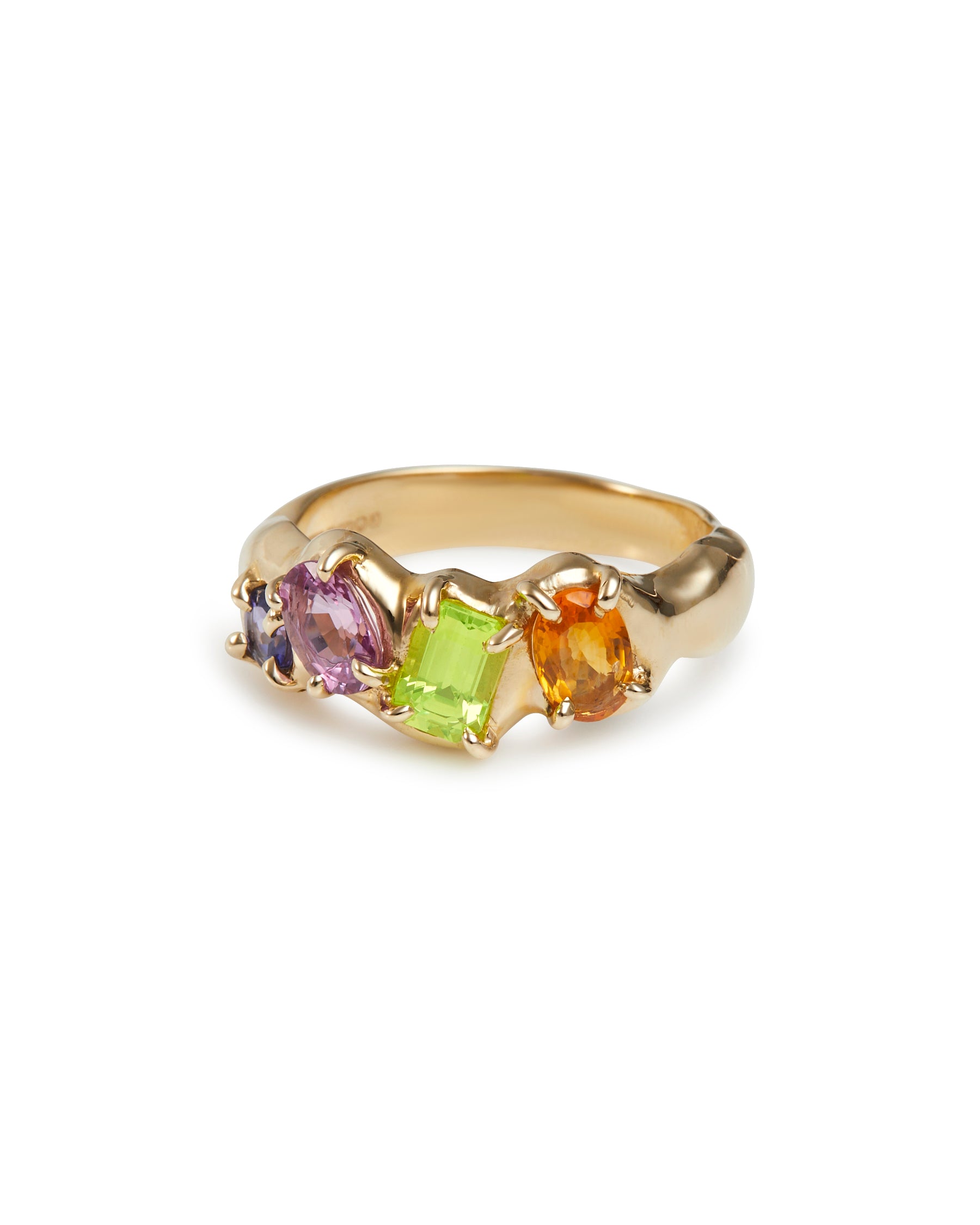 This bold, organic-style ring features a fluid, sculpted band crafted in high-polish 14k yellow gold with a soft, wave-like silhouette. It showcases an asymmetrical arrangement of gemstones, each set in a hand-finished setting that enhances the ring’s artisanal character.