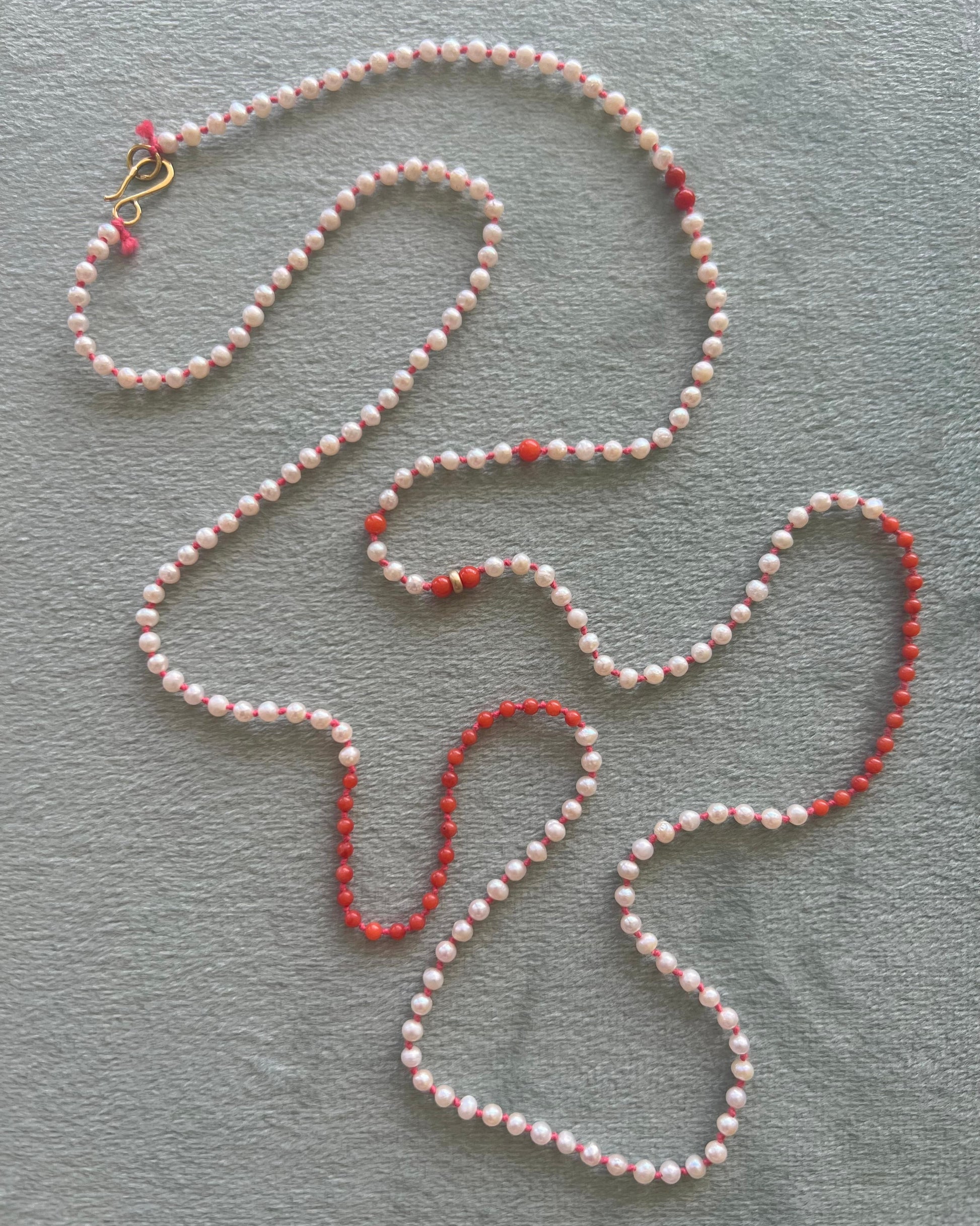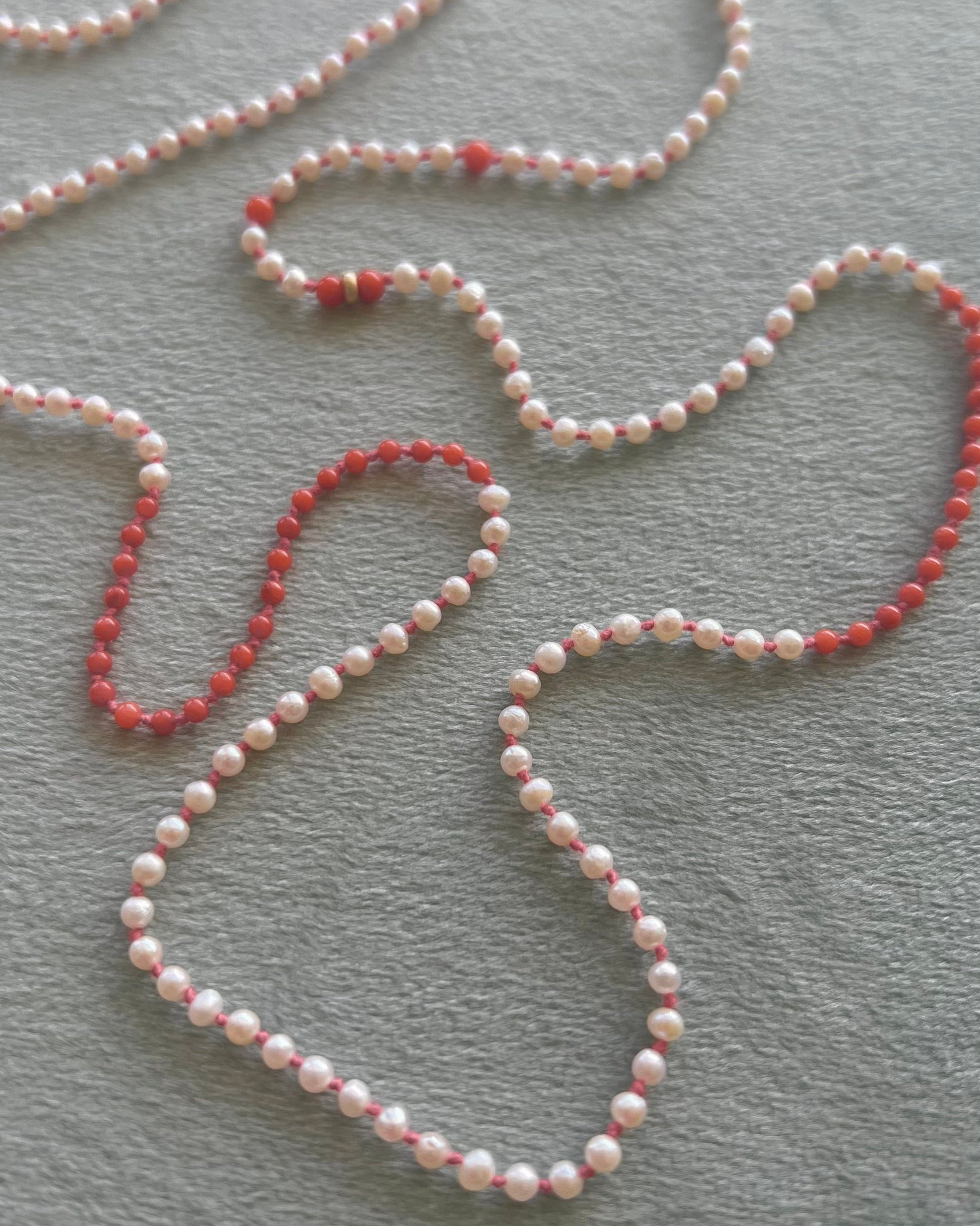 Round pearls and coral beads on knotted coral colored thread and 14k gold clasp. Measures 31"