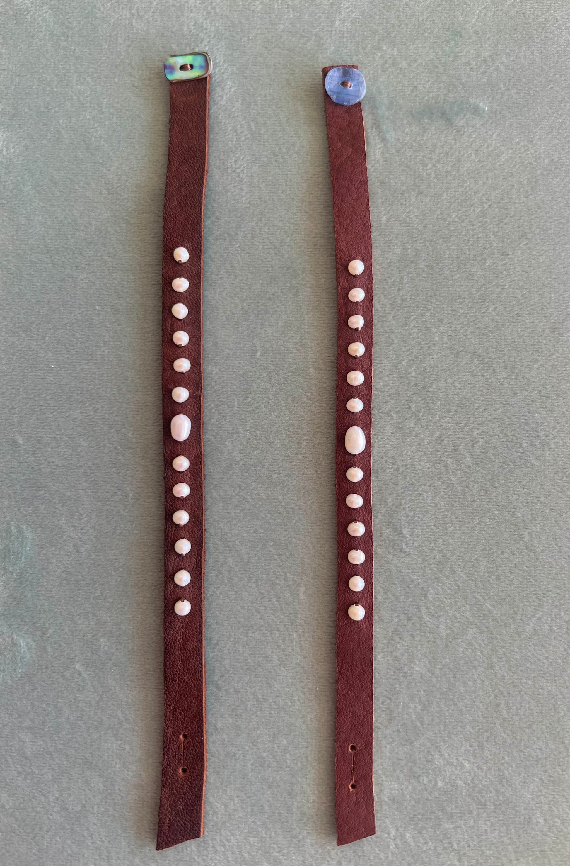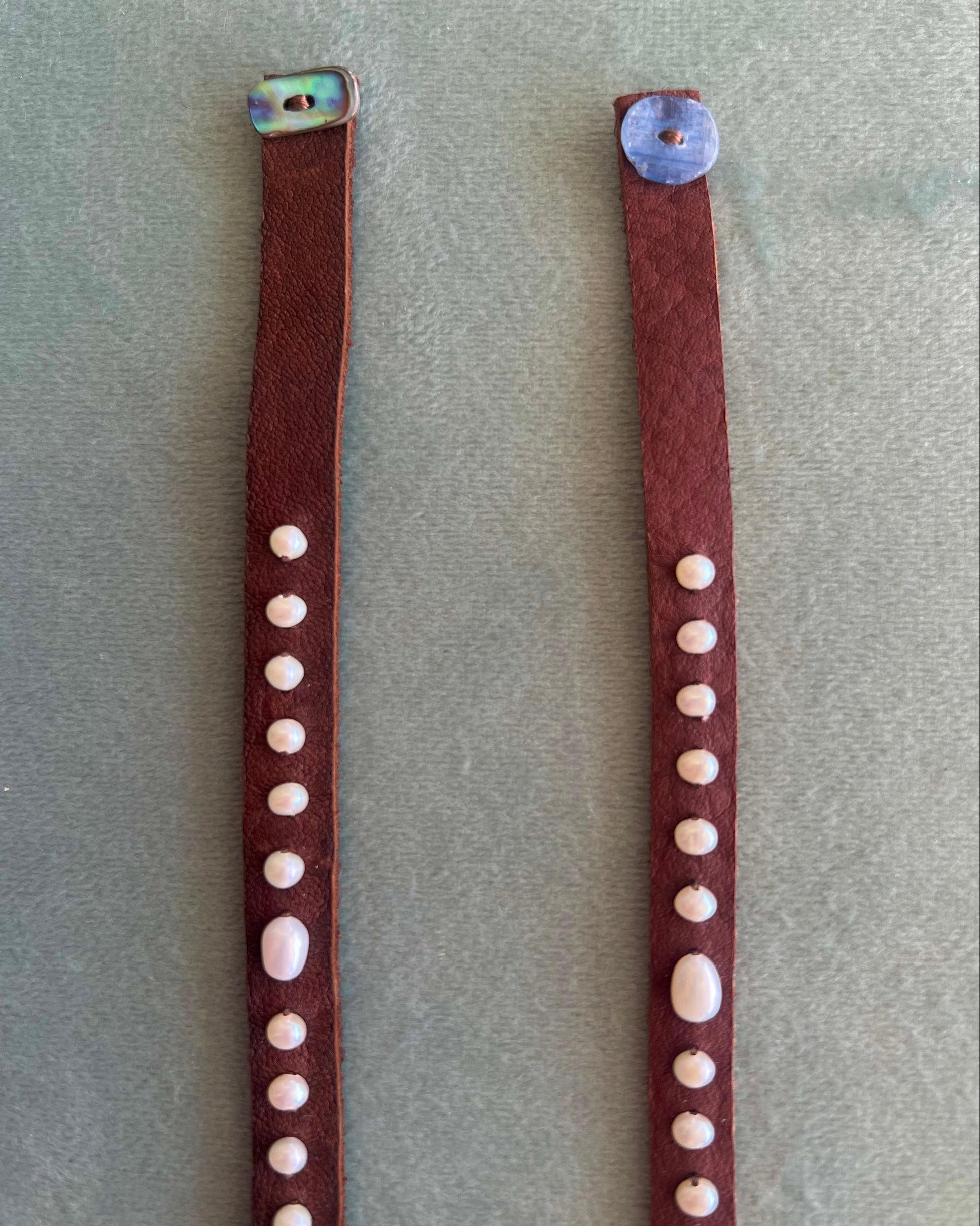 Keshi pearls on chocolate brown leather, with either Abalone(left) or Kyanite(right) button clasp.