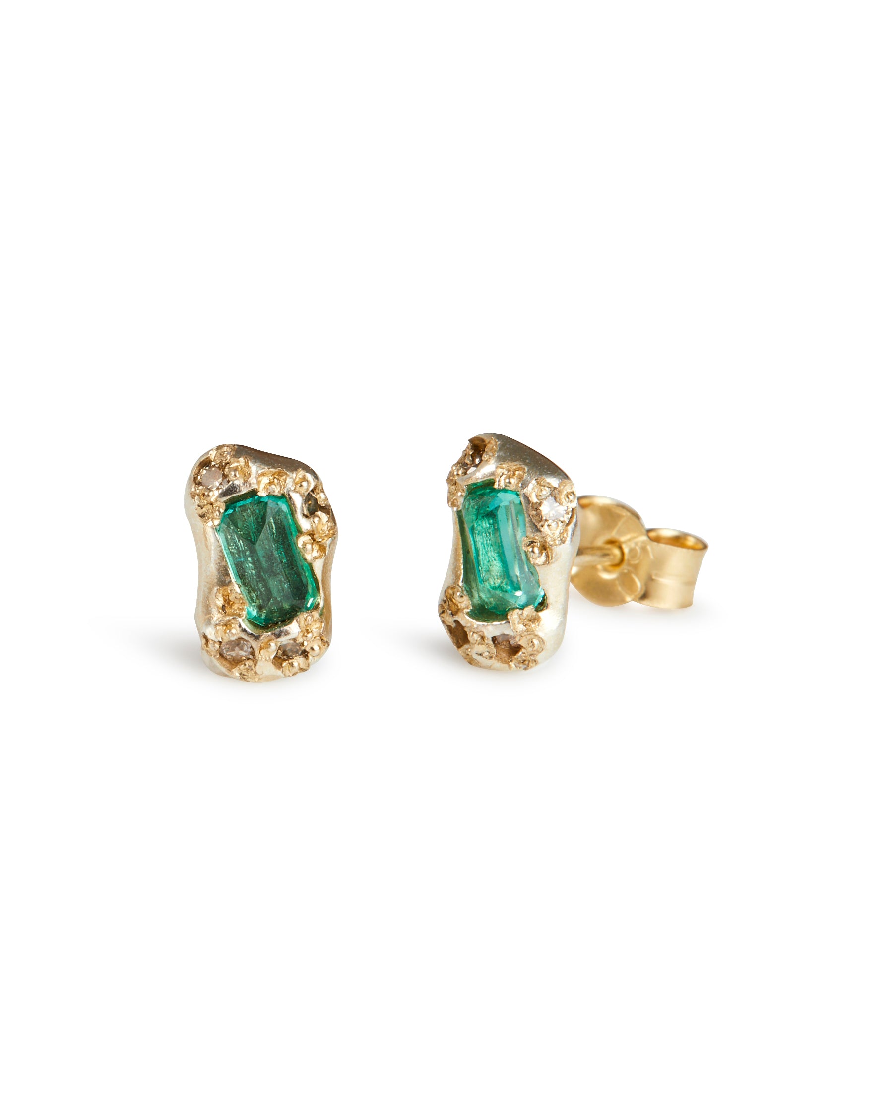 A stud designed to quietly elevate your ear stack, the Pixie Stud carries neutral tones of emerald and brown diamonds. Set into warm gold to amplify the natural glow of the emeralds.