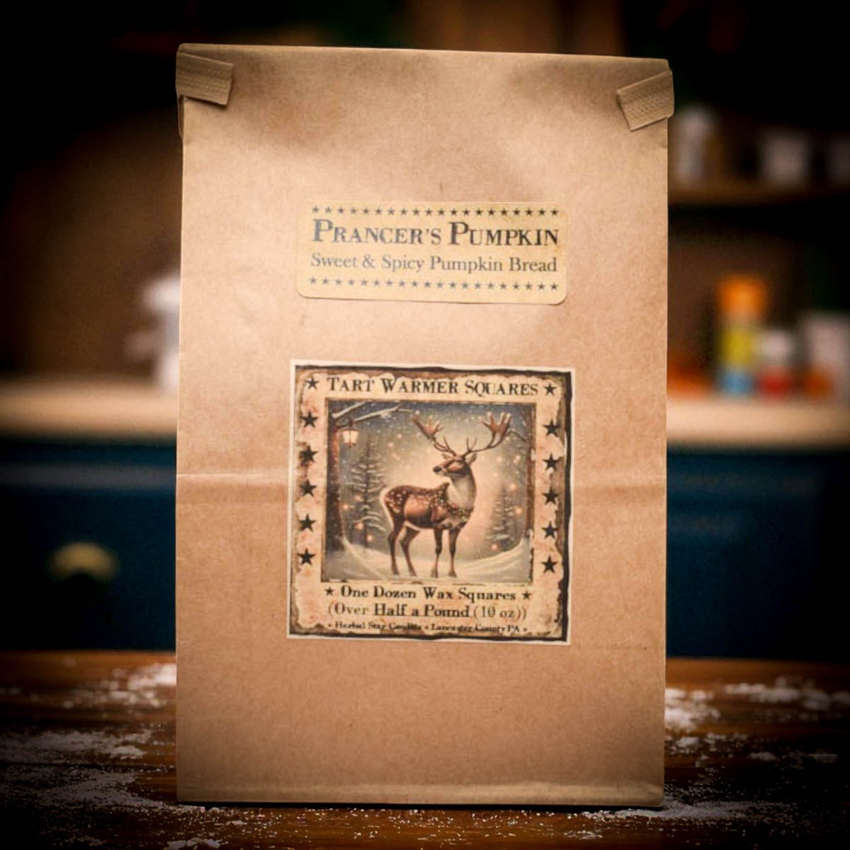 Our Prancer's Pumpkin Bread Bag of Tarts holds twelve soy-blend wax squares—over half a pound of sweet vanilla, cinnamon, and nutmeg for flameless holiday fragrance.