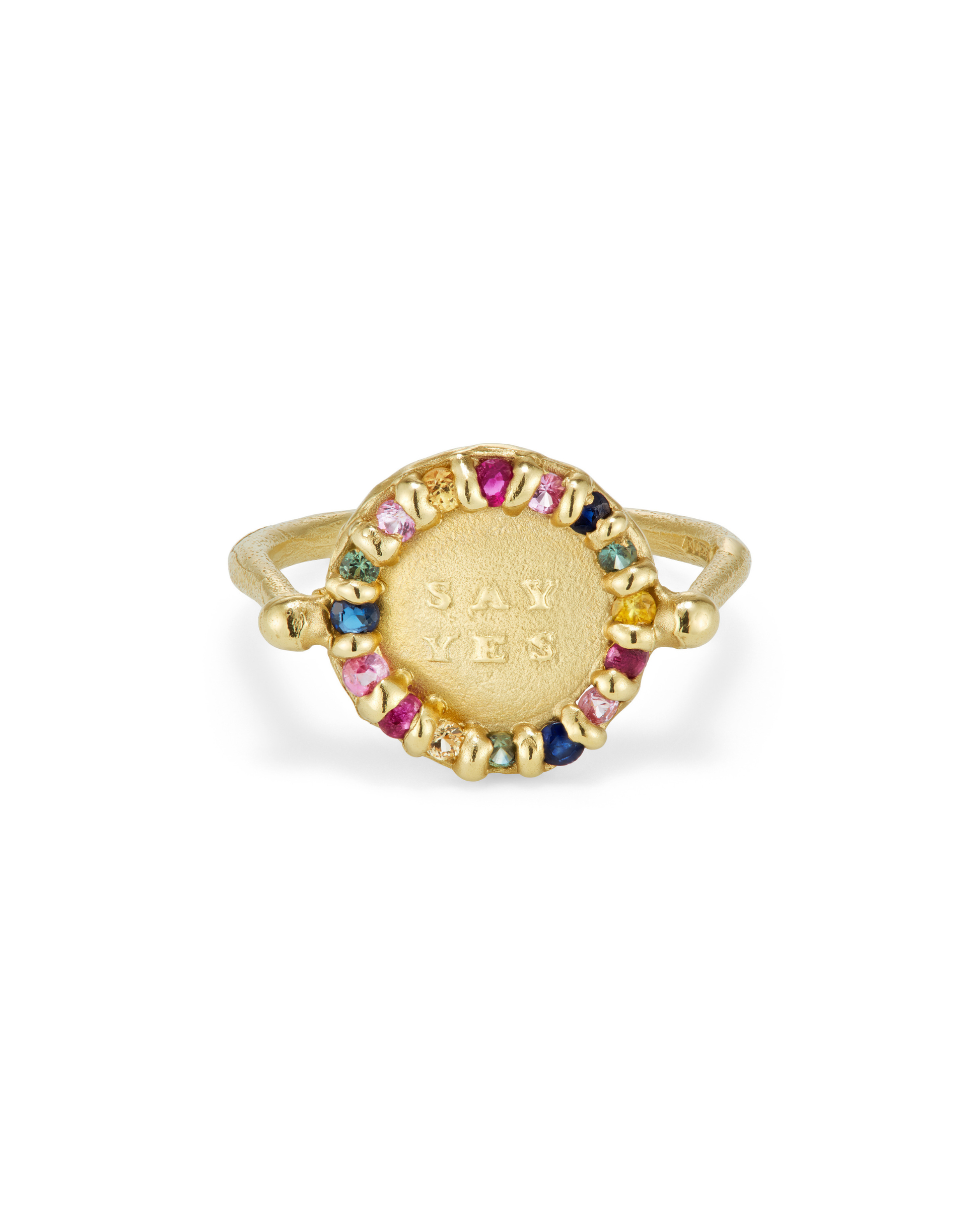 "Say Yes" Ring is handcrafted in 9k yellow gold, adorned with rubies and multi colored sapphires.