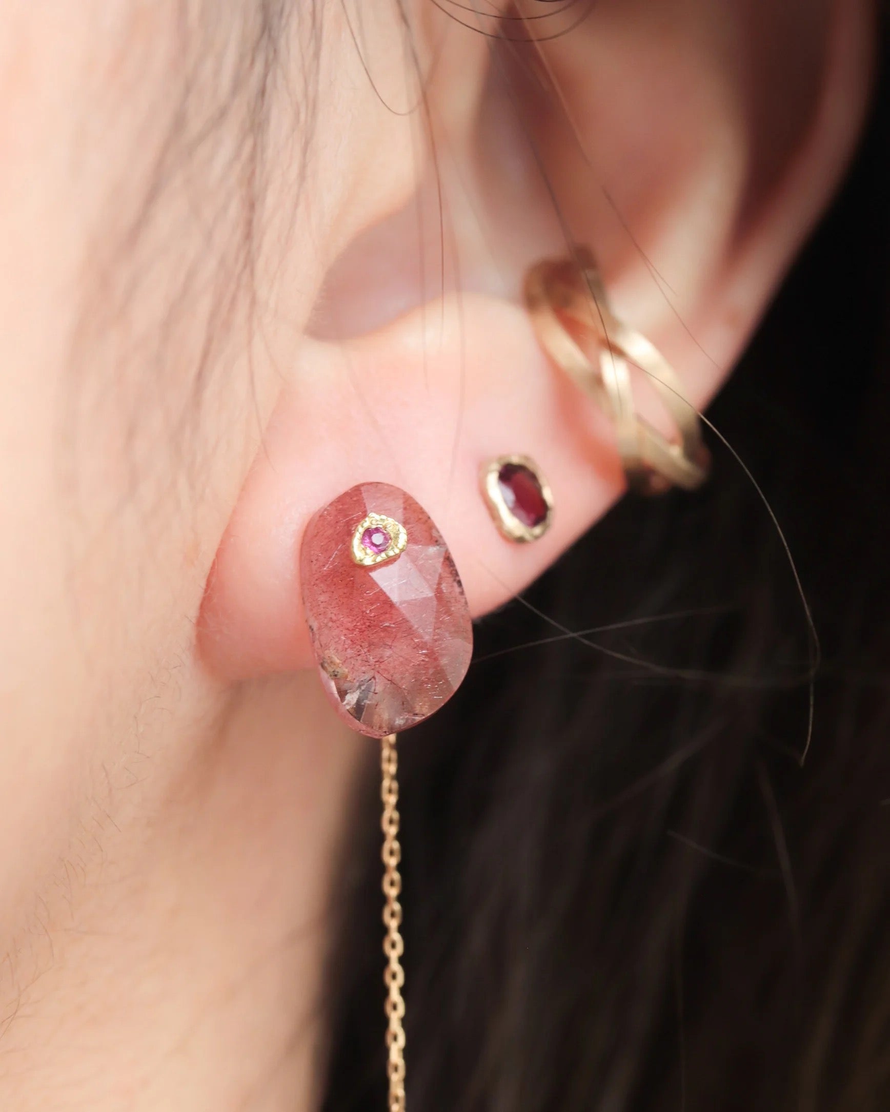 Strawberry Quartz Faceted Flat Stone with pink sapphire and 18k Gold Chain. Sold as a pair.