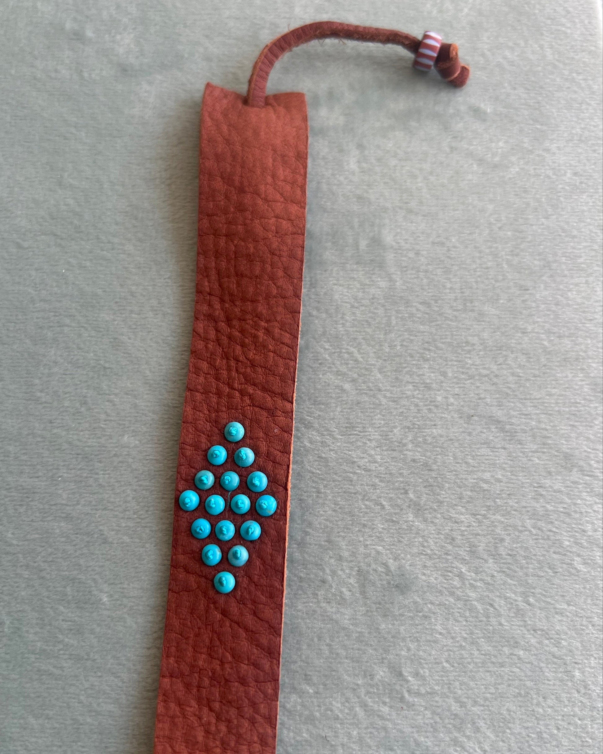 Persian Turquoise beads (diamond shape design) on chocolate brown leather, with open leather strand and finished with trade-beads